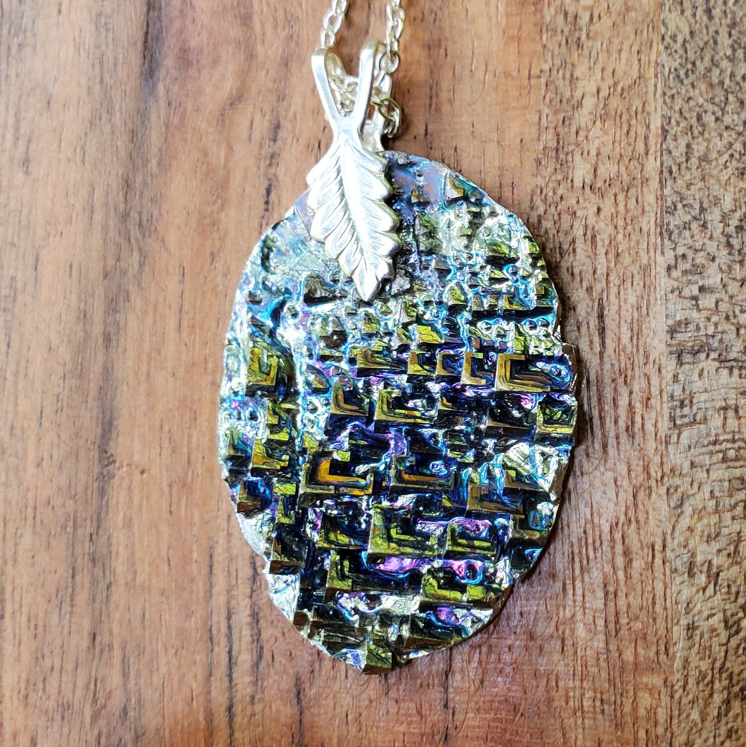 These pendants are formed by melting the Bismuth and allowing the crystals to form naturally. Each piece is completely unique. There are two different kinds of pendants. Flat and 3D. Please choose which type that you desire.